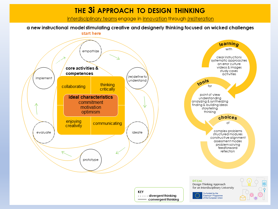 Become familiar with the six phases in each challenge that follow the 3i Approach to Design Thinking, where interdisciplinary teams engage in innovation through (re)iteration, in a design thinking model designed under the coordination of the Guarda Polytechnic University (IPG, from the Portuguese Instituto Politécnico da Guarda) partner team for the Erasmus+ project DT.Uni: Design Thinking Approach for an Interdisciplinary University (2017-2020, nº 2017-1-PL01-KA203-038527).